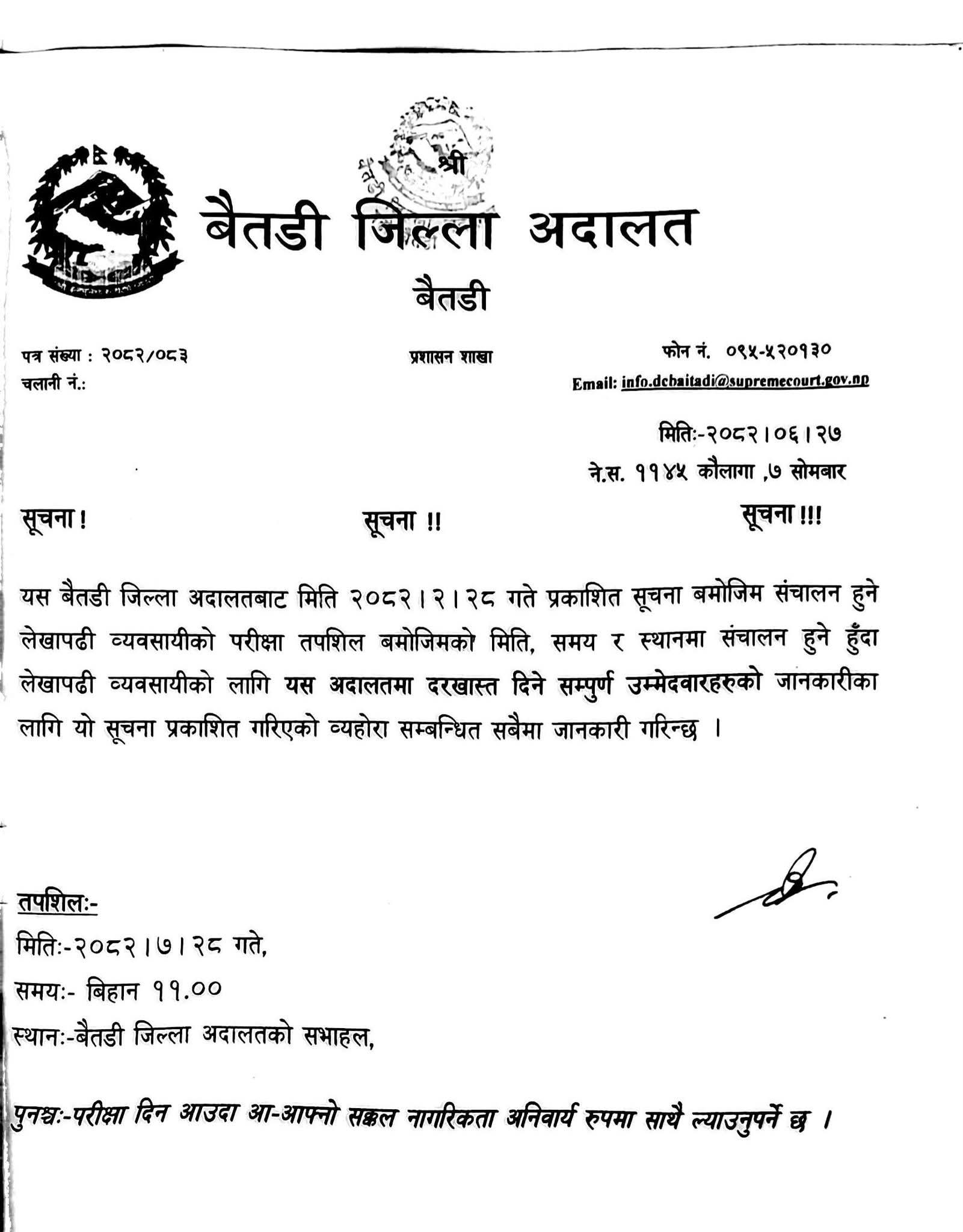 लेखापढी व्यवसायीको परिक्षा मिति सम्बन्धी सूचना ।